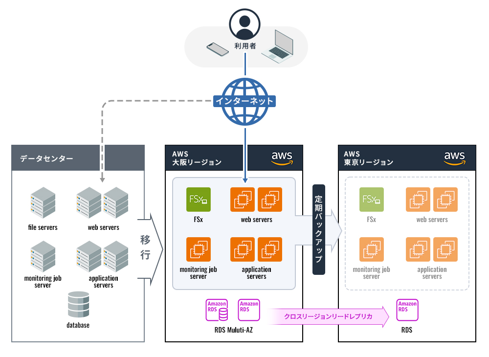 オンプレミスで稼働している既存システムをAWSへ移行し、ハードウェアのEOSLに伴うシステム更改によるコスト削減を実現。同時に災害復旧(DR)対策を実現。